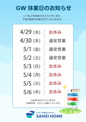 【全社GW休業日】 5月3日(日)~6日(水) 4日間