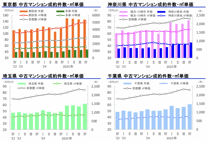 首都圏や近畿圏の中古住宅は、平均価格ベースではいまだ上昇傾向にありますが、首都圏では東京23区や、近畿圏では大阪市が価格上昇を牽引している構図です。他県や交通利便性が低いエリアでは、すでに価格調整局面に入りつつある地域も見られます。